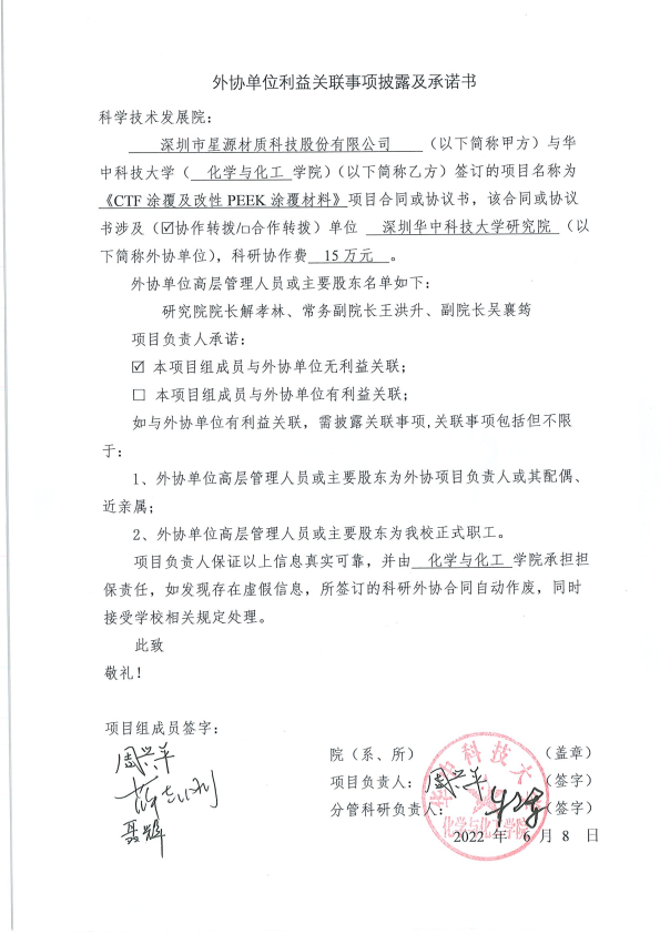 根据《华中科技大学科研外协项目管理办法》,对我院《CTF涂覆及改性PEEK涂覆材料开发》项目的外协单位利益关联事项披露及承诺书进行公示。
