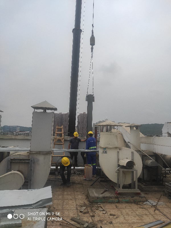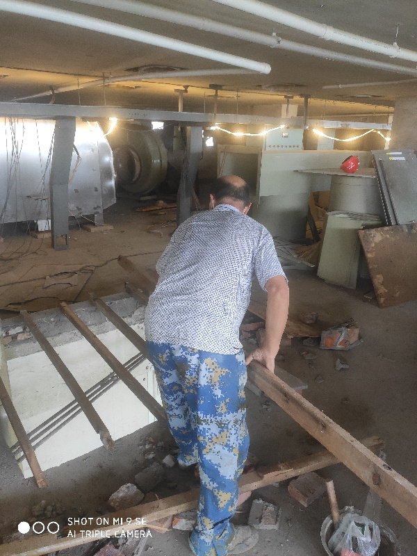 3、723,通风改造施工队聘请的吊车进场,经过监理对吊车及人员相关资料核验无误后,进行吊装作业,725日完成附楼原有钢架拆卸工作,726日开始对新钢架进行吊装。