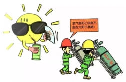 7、装卸野蛮致碰撞,曝晒升压致爆炸:气瓶严禁敲击、碰撞,必须轻搬轻放。气瓶应防止曝晒,夏天装运气瓶时,要有遮阳物覆盖,尤其是露天堆放的气瓶。