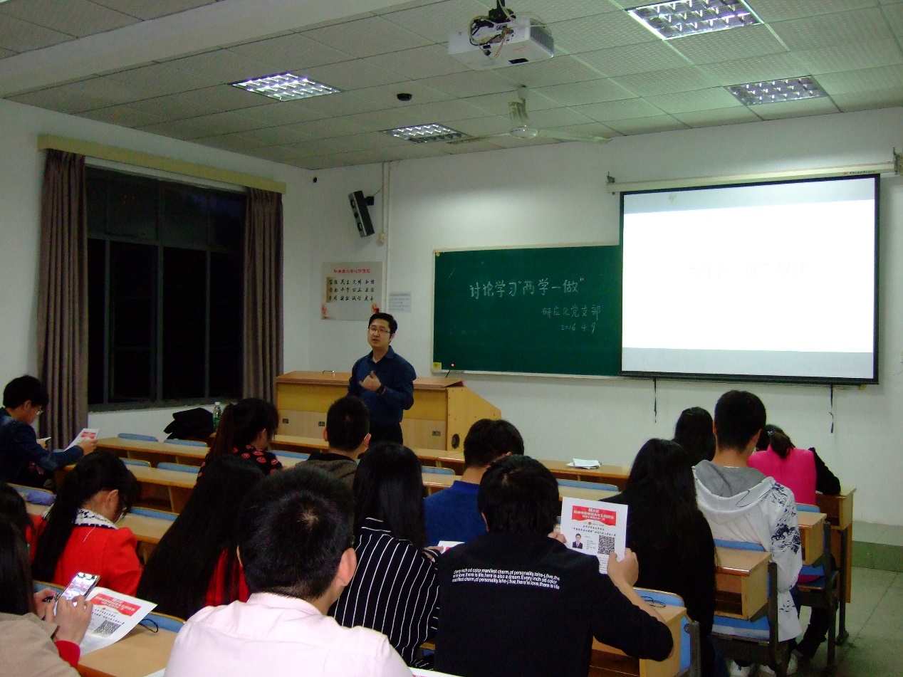 近日,为响应党中央关于开展“两学一做”学习教育的号召,进一步解决党员队伍在思想、组织、作风、纪律等方面存在的问题,我院研究生应用化学党支部于4月9日晚19:00时在西五楼401教室组织开展了“两学一做”专题学习研讨会。学院第二教师党支部支部书记夏帆老师也参与了学习讨论。