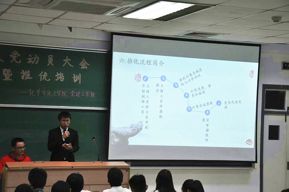 2015年11月6日晚6点半,由化学与化工学院党建工作组组织部举办的入党动员大会暨推优培训在西十二N203正式举行。研究生应化党支部书记夏婷,14-15级本科生联合党支部书记周韵,党建工作组常务副主任纪红艳等作为嘉宾出席了本次会议。