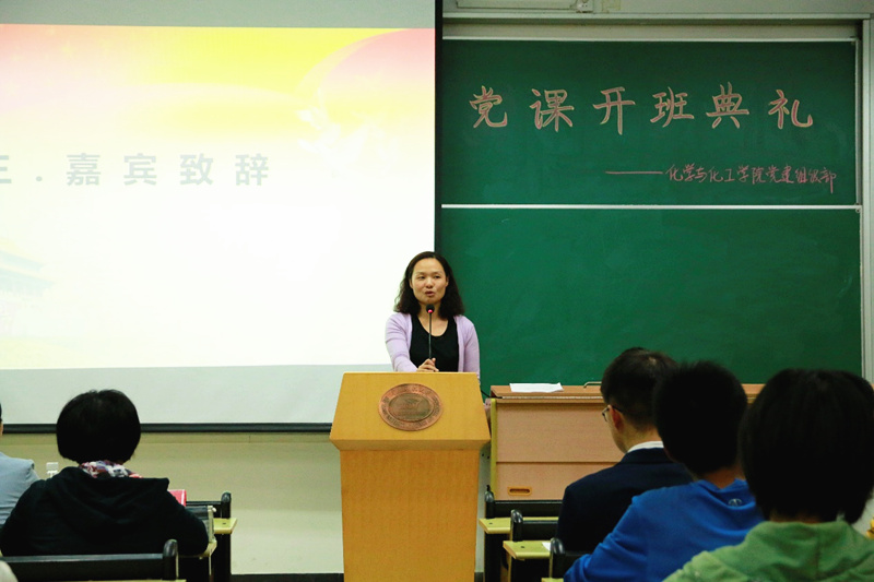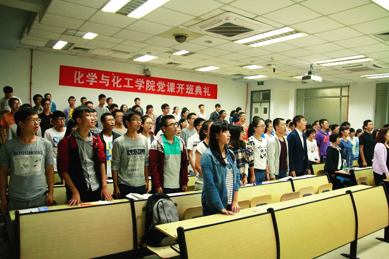 2015年10月23日晚上6:30,化学与化工学院党课开班典礼在西十二N203成功举行。出席本次典礼的有化学与化工学院党总支部副书记吴疆鄂老师、化学与化工学院学工组辅导员付冰冰老师、13级党支部书记朱国梁学长。本次典礼由党建组织部部委郭昊宇主持。
