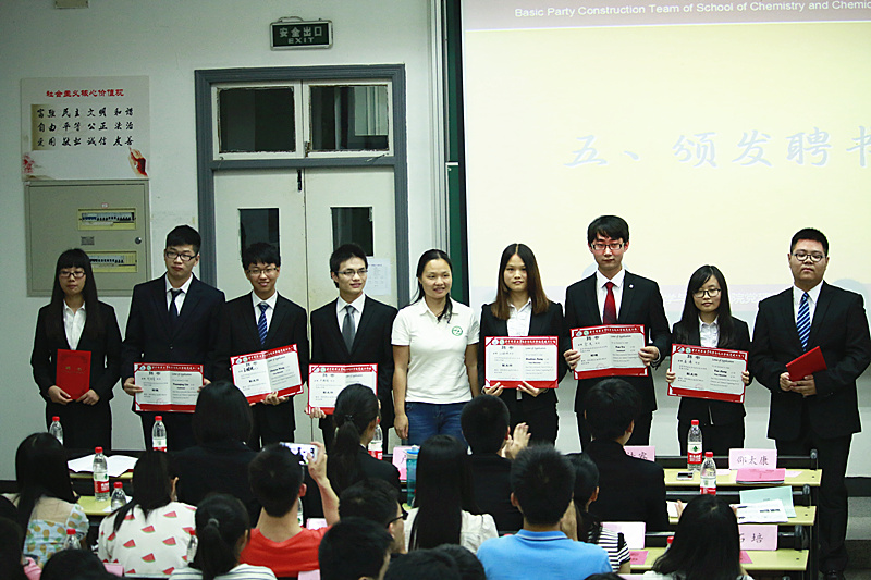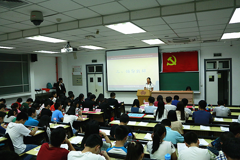 2015年6月10日晚19点整,华中科技大学化学与化工学院党建工作组第三次换届大会在西十二N101教室成功举办。化学与化工学院党总支副书记吴疆鄂,化学与化工学院党建辅导员付冰冰,11级、14级化学辅导员曾祥胜,各院系党建工作组负责人以及学院各级学生组织代表、支部代表及班级代表出席大会,一起见证党建工作组新一届领导小组的诞生。