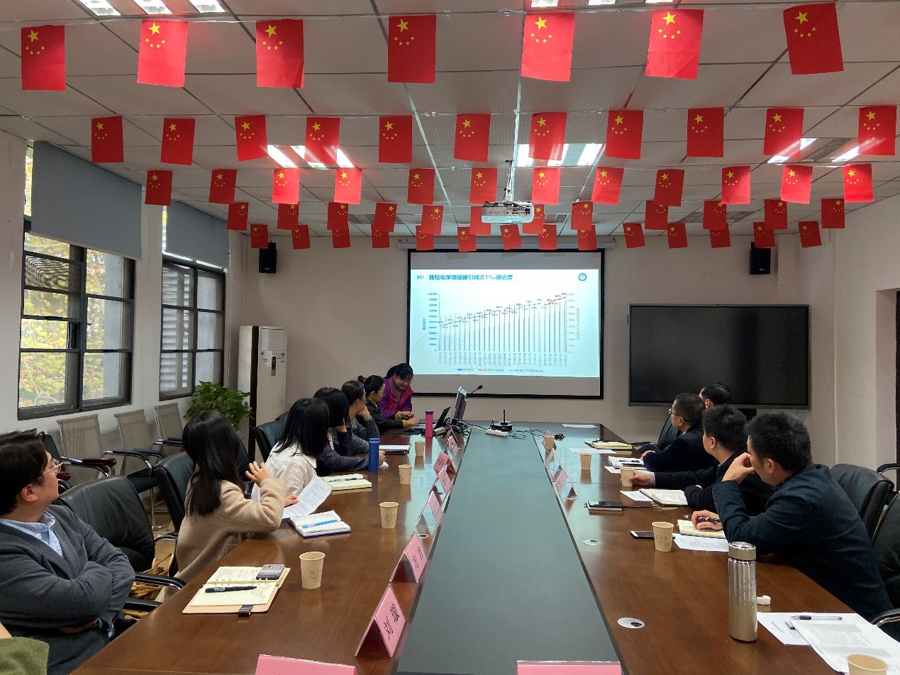 为进一步提升我院ESI竞争力,实现化学学科早日迈进ESI前1‰优势学科行列的战略目标,11月14日下午4:00,化学与化工学院2019年化学学科ESI数据分析与提升调研座谈会在东三楼321会议室举行。本次座谈会特邀华中科技大学图书馆副馆长袁青一行九人做客我院,就我校ESI化学学科发展态势、ESI指标解读、论文署名勘误与学者ID构建、图书馆服务四方面进行分享与交流。化学与化工学院党委书记李涛、院长朱锦涛、副院长刘宏芳、谭必恩及各系所教师出席了座谈会。座谈会由化学与化工学院院长朱锦涛教授主持。