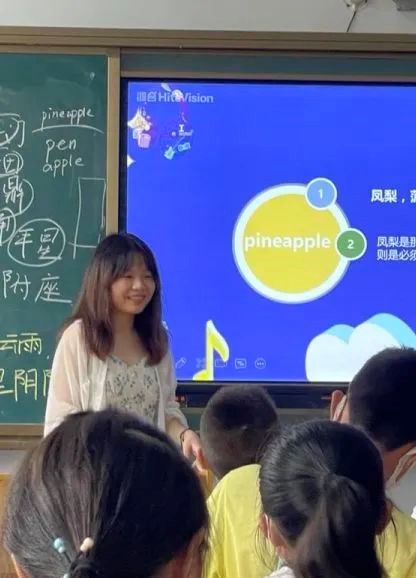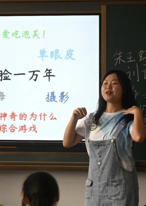 蒋梦珍队员的课程,将带同学们学习一手英文歌,以及英文歌中的一些简单单词。“小蒋老师”选的歌曲是日本歌曲PPAP,简单易懂,朗朗上口,同学们热情参与,学习积极,热情高涨,歌声响彻整个教学楼。