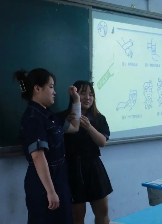 王雅琪队员为孩子们带来的医学健康知识课,与王雅琪同学自己的专业相匹配,教学起来也是游刃有余、轻车熟路。雅琪同学为了调动同学们的积极性,将学习内容从大屏幕上摘下来,放到同学们的手中:教孩子们如何利用绷带包扎。