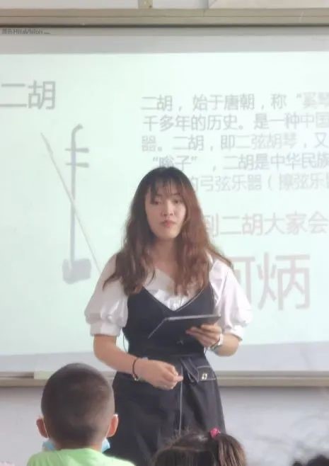 小郑老师充分发挥艺术专业的特长,生动形象地给孩子们讲授关于民族乐器的各种知识,并且还将自己的二胡带给孩子们现场观看,充分调动了孩子们的积极性,同时也是在告诉孩子们,中国的民族乐器也是多种多样的,中国的民族乐器完全不输西洋乐。