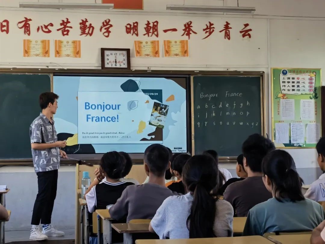第三节课,周宇轩队员为同学们带来了独有的风情特色——法国文化课(法语课),在新知中体味异国文化,在陈见中追踪别样风采。学生们听得津津有味,目光如炬,透露出新文化的炽热渴望。