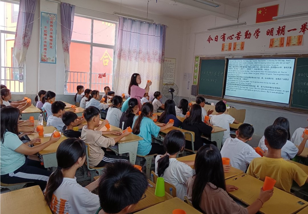 这堂课继续由徐静仪队员教授,带来了有趣的杯子舞教学。70名同学,用杯子集体演绎一段乐章,场面必定震撼人心。随着美妙的音乐,学生们变花样“玩”塑料杯,翻、扣、击掌...让人眼花缭乱。杯子舞独具特色,教室里所有人都沉浸在轻松愉快的节奏中,其他支教队员也纷纷学习起来。
