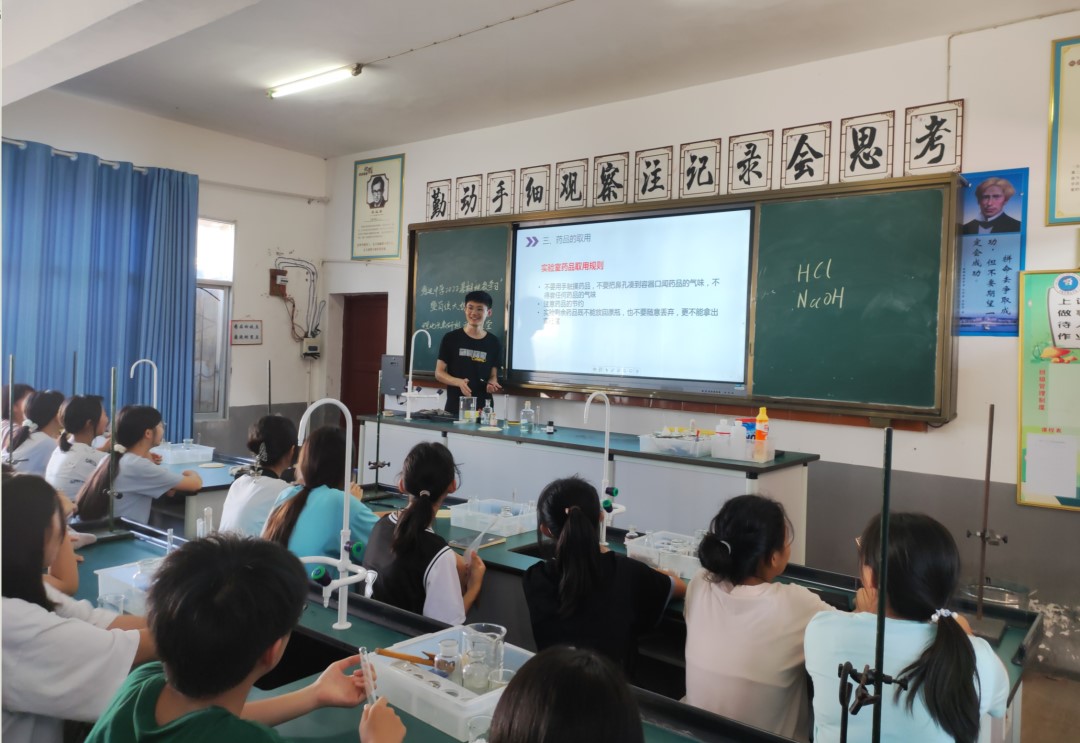 今天最后一节课由梁政队员的化学实验课作结。课堂正式开始之前,梁政队员已提前熟悉了学校的实验室和实验器材,做好了实验教学的充分准备。面对实验课,学生们表现得非常兴奋。在介绍了化学实验的实验室基础要求等之后,学生们自己动手做实验,兴致十足。
