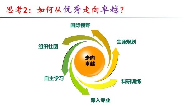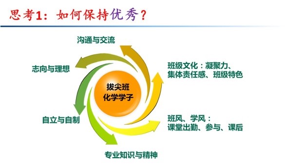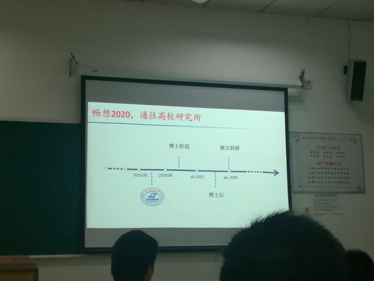 “到2020年,你希望你的脚步能走到哪里?”通过班会的讨论和分享,每位拔尖班同学对这个问题都开始了自己的思考。针对这个问题,班主任钟老师在讨论会的最后做了总结和一个简短的报告。钟老师分析了我们16级拔尖班同学毕业后的可能选择的职业道路,并以一个时间坐标轴为图,阐述了学术道路接下来十年将要行走的大概轨迹:2020年本科毕业、2025年左右博士毕业,2029年前后在博士后科研经历后可以开始独立科研生涯。钟老师还介绍了国外的Tenure track—“非升即走”制度。每个人成长和成功的足迹都是不一样的,但是选择一个成功的榜样是很有激励作用的。钟老师以国内知名化学家为例解释了国内科研人员的学术发展之路,鼓励同学们要树立远大的志向,明确自己的定位和清晰的目标,并脚踏实地地去走。钟老师以分析滴定实验为例,告诉大家不要急躁,要学会坚守,正如“滴定管长长的,我们的未来长长的,坚持用心地放入每一滴,终点就在你手中”这句话所言喻的一样。