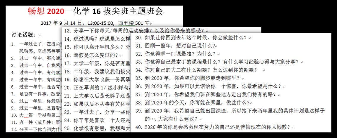9月14日下午,一场以“畅想2020”为主题的别开生面的班会在主校区西五501教室举行,这是化学1601拔尖班自发组织召开的系列主题班会之一。