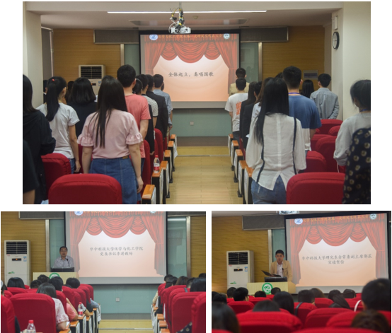 大会在激昂的《义勇军进行曲》中开幕,全体成员庄严肃穆地起立并奏唱国歌。首先,化学与化工学院党委书记李涛老师致大会开幕词。他提出了此次大会的三项主要任务:第一,听取第六届研究生会的工作报告;第二,全体代表共同听取、讨论华中科技大学化学与化工学院七届一次研究生代表大会提案;三是全体代表投票选举出华中科技大学第七次研究生代表大会化学与化工学院代表团代表。接着华中科技大学研究生会常务副主席郭晨致贺词。