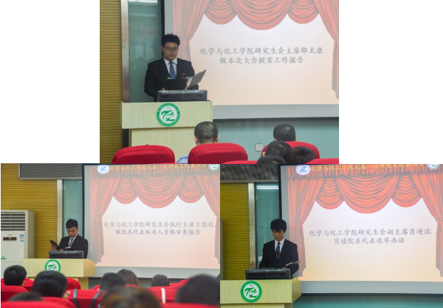 接着,化学与化工学院研究生会主席邵太康作了《华中科技大学化学与化工学院七届一次研究生代表大会提案工作报告》,化学与化工学院研究生会执行主席王思远作《华中科技大学第七次研究生代表大会化学与化工学院代表候选人资格审查报告》,化学与化工学院研究生会副主席肖逐流作《华中科技大学第七次研究生代表大会化学与化工学院代表选举办法》。表明希望各位代表都能本着严肃、认真、负责的精神参加大会的各项活动,将此次会议开成一个“团结、民主、奋进、求实”的盛会。